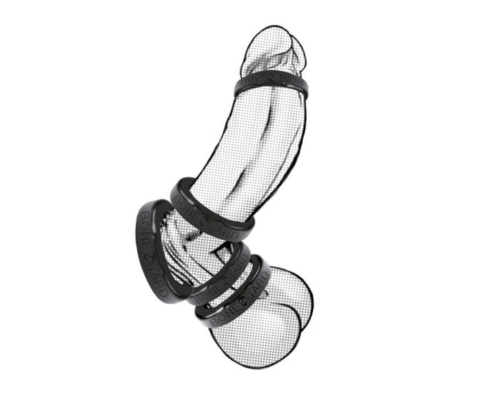 Boneyard Silicone Ring 1.6″ (40mm) Black These must-have man toys are designed with superior materials and production thus increasing both comfort and lifespan. The powerful and iconic Boneyard-branded design has a sleek silicone finish and features a superior and durable 3x-stretch. The soft medical grade 100% silicone rings and non-roll design provide a snug fit that both the wearer and his playmates will appreciate. Unique to themselves, these rings synergize with the wearer, providing endless comfort when wearing under your jeans. You can be assured that they will withstand the punishment of your longest play sessions time and time again.