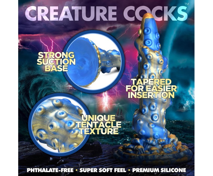 - Creature Cock Dildo: Blue and gold, it shimmers in the light. The twisted spiral that ascends to the tip of this dong adds extra sensation along with multiple, small suckers. At the base are tiny waves splashing against the rod.